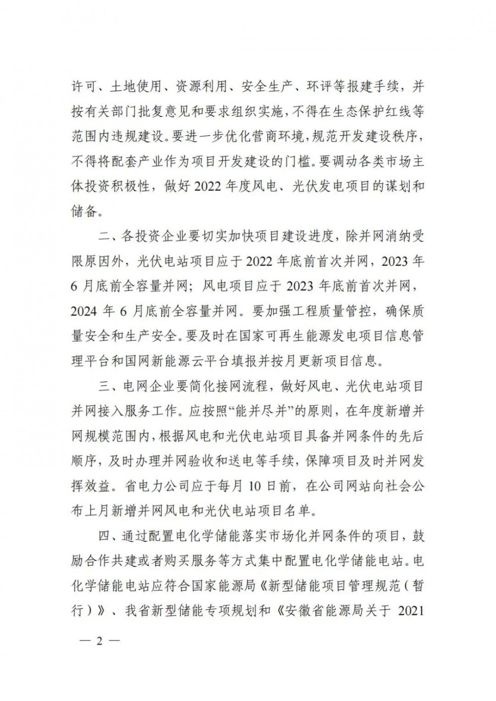 此外,安徽省要求各投資企業(yè)要切實(shí)加快項(xiàng)目建設(shè)進(jìn)度,除并網(wǎng)消納受限原因外,光伏電站項(xiàng)目應(yīng)于2022年底前首次并網(wǎng),2023年6月底前全容量并網(wǎng);風(fēng)電項(xiàng)目應(yīng)于2023年底前首次并網(wǎng),2024年6月底前全容量并網(wǎng)。