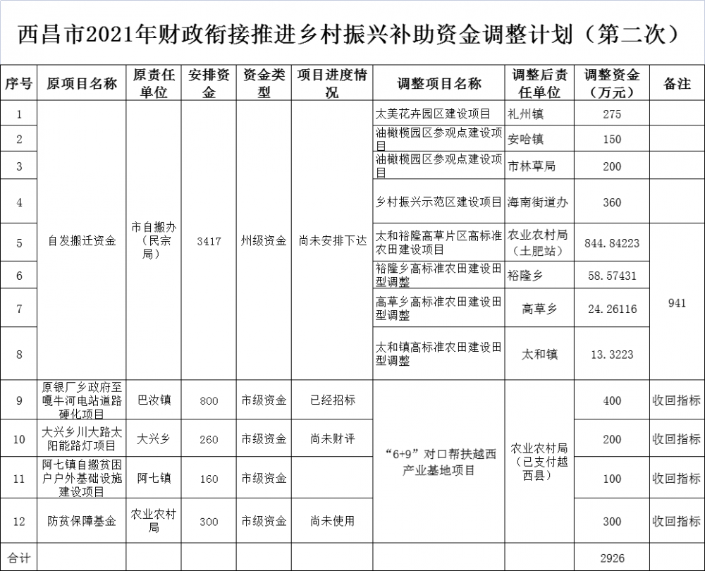 根據西昌市鄉村振興局《關于再次調整使用2021年銜接推進鄉村振興補助資金的請示》(西鄉振發(2021)18號)文件及領導批示,現將2021年下達市委統戰部(自搬辦):1、自發搬遷資金1926萬元調整到禮州鎮太美花卉園區建設項目275萬元、 安哈鎮油橄欖園區參觀點建設項目150萬元、市林草局油橄欖園區參觀點建設項目200萬元、海南街道辦事處鄉村振興示范區建設項目360萬元、太和裕隆高草片區高標準農田建設項目941萬元;2、收回以下單位指標:⑴、巴汝鎮原銀廠鄉政府至嘎牛河電站道路硬化項目資金400萬元;⑵、大興鄉川大路太陽能路燈項目資金200萬元;⑶、阿七鎮自搬貧困戶戶外基礎設施建設項目資金100萬元;⑷、農業農村局防貧保障基金300萬元;3、將西昌市援建越西縣 “6+9”對口幫扶越西產業基地項目1000萬元調入鄉村振興項目,給予在網上公示。