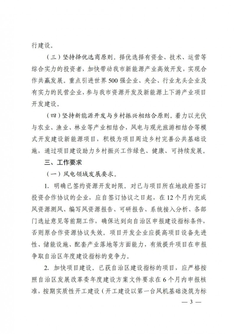 對(duì)已獲自治區(qū)建設(shè)指標(biāo)的項(xiàng)目,應(yīng)嚴(yán)格按照自治區(qū)發(fā)展改革委年度建設(shè)方案文件要求按期實(shí)質(zhì)性開(kāi)工建設(shè)、完工和實(shí)現(xiàn)并網(wǎng)發(fā)電,否則取消項(xiàng)目建設(shè)權(quán)限。