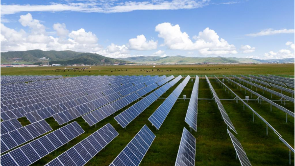位于青海省海南藏族自治州共和縣塔拉灘的千萬千瓦級生態光伏發電基地,新割過的草地平展如毯,整齊的光伏矩陣間,工人們手持水管,給光伏板洗塵。遠處,羊群穿梭,自由覓食。