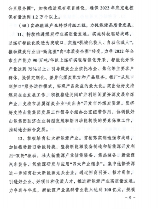持續(xù)提升新能源和可再生能源開(kāi)發(fā)利用規(guī)模。落實(shí)市政府《關(guān)于加快新能源和可再生能源高質(zhì)量發(fā)展意見(jiàn)》,統(tǒng)籌優(yōu)化新能源開(kāi)發(fā)布局,提質(zhì)升級(jí)發(fā)展“光伏+”工程,穩(wěn)步有序發(fā)展生物質(zhì)能,打造新能源多元化利用示范基地。一是突出抓好華能嘉祥梁寶寺150兆瓦“農(nóng)光互補(bǔ)”項(xiàng)目(一期)等8個(gè)納入電網(wǎng)接入和消納意見(jiàn)的新能源項(xiàng)目建設(shè),積極推進(jìn)嘉祥、梁山、魚(yú)臺(tái)、鄒城和曲阜整縣分布式光伏規(guī)?;_(kāi)發(fā)試點(diǎn)工作。全力支持時(shí)代永福濟(jì)寧漁光互補(bǔ)項(xiàng)目和山能集團(tuán)在濟(jì)寧分布式光伏項(xiàng)目建設(shè)。二是大力發(fā)展智慧能源,積極推進(jìn)泗水海螺工業(yè)園區(qū)“零購(gòu)電”源網(wǎng)荷儲(chǔ)一體化智慧示范園區(qū)和魯抗鄒城園區(qū)綠色能源示范項(xiàng)目建設(shè)。三是探索發(fā)展儲(chǔ)能產(chǎn)業(yè),在用戶側(cè)、電源側(cè)和電網(wǎng)側(cè)分類推進(jìn)儲(chǔ)能示范工程建設(shè),力爭(zhēng)2022年建成11萬(wàn)千瓦左右的儲(chǔ)能設(shè)施。