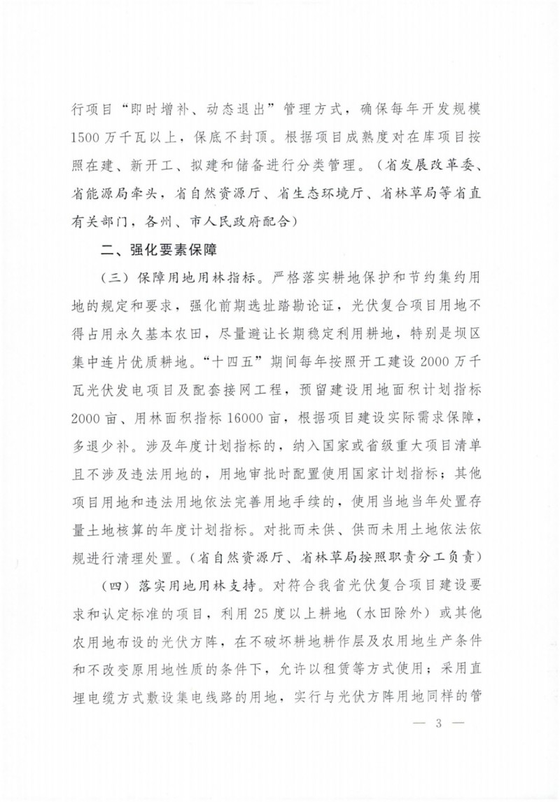 “十四五”期間按照每年開工20GW光伏項(xiàng)目及配套接網(wǎng)工程預(yù)留建設(shè)用地面積2000畝、用林面積1600畝,根據(jù)實(shí)際需求多退少補(bǔ)。對(duì)于涉及國家或省級(jí)重大項(xiàng)目的,用地審批配置國家計(jì)劃指標(biāo)。對(duì)于符合光伏復(fù)合項(xiàng)目建設(shè)要求和認(rèn)定標(biāo)準(zhǔn)的,利用25度以上耕地或其他農(nóng)用地的,在不破壞耕地、不改變?cè)玫匦再|(zhì)的項(xiàng)目允許以租賃方式使用。