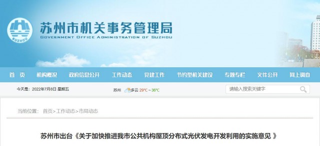 近日,蘇州市機(jī)關(guān)事務(wù)管理局、蘇州市發(fā)展和改革委員會聯(lián)合發(fā)布《關(guān)于加快推進(jìn)我市公共機(jī)構(gòu)屋頂分布式光伏發(fā)電開發(fā)利用的實(shí)施意見》(下稱“意見”),這是全面貫徹黨中央、國務(wù)院和省委、省政府關(guān)于碳達(dá)峰碳中和決策部署的具體行動,也是落實(shí)省機(jī)關(guān)事務(wù)工作年度會議精神的重要抓手。