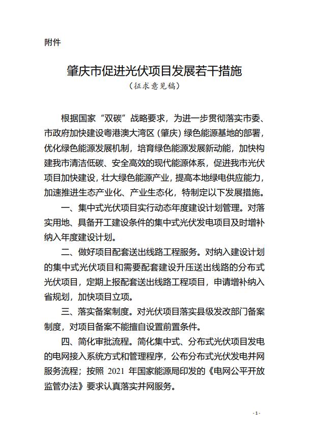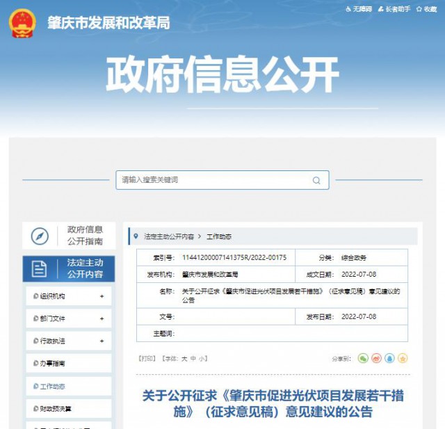 7月8日,廣東省肇慶市發(fā)改局發(fā)布關(guān)于公開征求《肇慶市促進光伏項目發(fā)展若干措施》(征求意見稿)意見建議的公告。