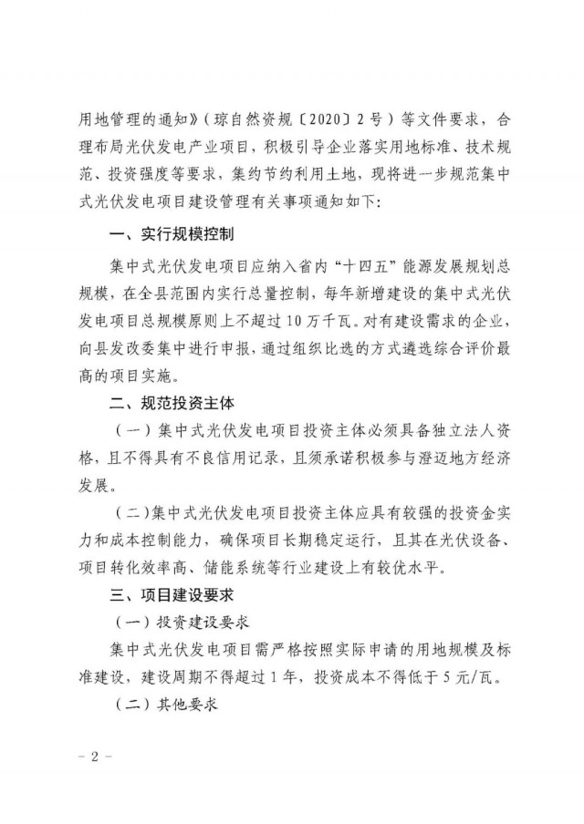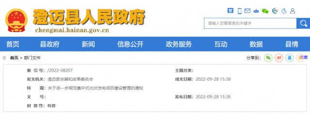9月28日,澄邁縣政府網(wǎng)發(fā)布“關(guān)于進(jìn)一步規(guī)范集中式光伏發(fā)電項目建設(shè)管理的通知”。