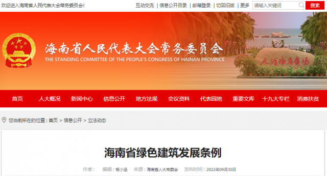 《海南省綠色建筑發(fā)展條例》已由海南省第六屆人民代表大會常務(wù)委員會第三十八次會議于2022年9月29日通過,現(xiàn)予公布,自2023年1月1日起施行。