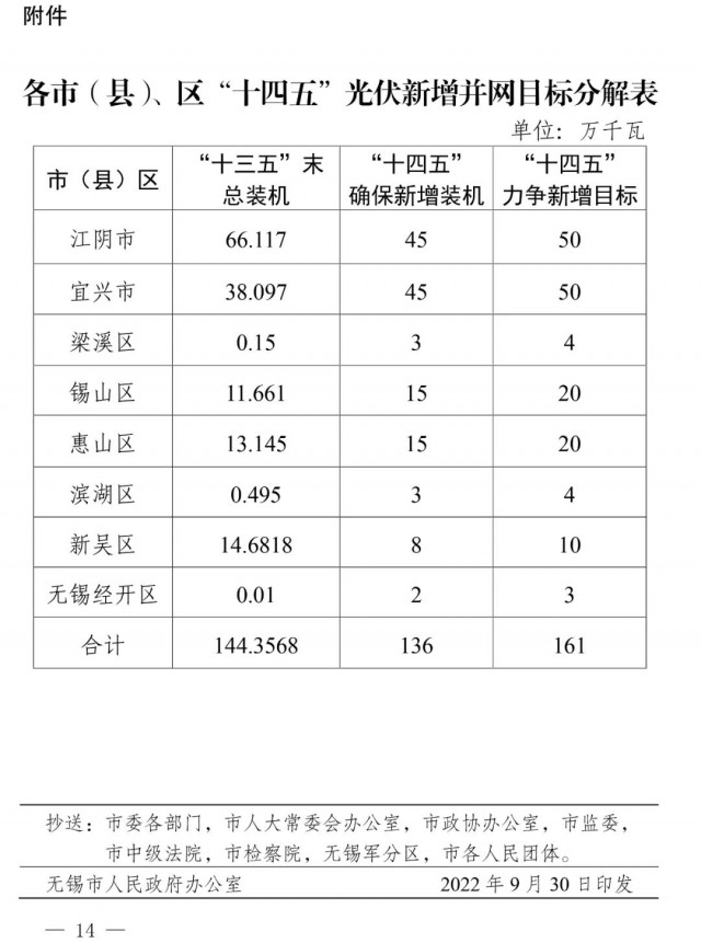 此外,“十四五”期間,對于完成新增并網(wǎng)目標,安排光伏發(fā)電補貼資金并落實補貼的地區(qū),市級自 2022年起分年度給予補助。對納入全國整縣(市、區(qū))屋頂分布式光伏開發(fā)試點的地區(qū),最高按其年度實際發(fā)放光伏發(fā)電專項補貼總額的30%進行補助;其他地區(qū)最高按照15%進行補助;對于建成國家整縣屋頂分布式光伏試點示范的地區(qū)視情給予獎勵(以上政策針對無錫市區(qū),江陰、宜興結(jié)合實際自行參照落實)。