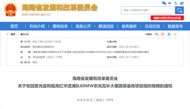 海南省發(fā)展和改革委員會關(guān)于收回紫光宜和臨高紅華透灘隊(duì)80MW農(nóng)光互補(bǔ)大棚蔬菜基地項(xiàng)目指標(biāo)規(guī)模的通知