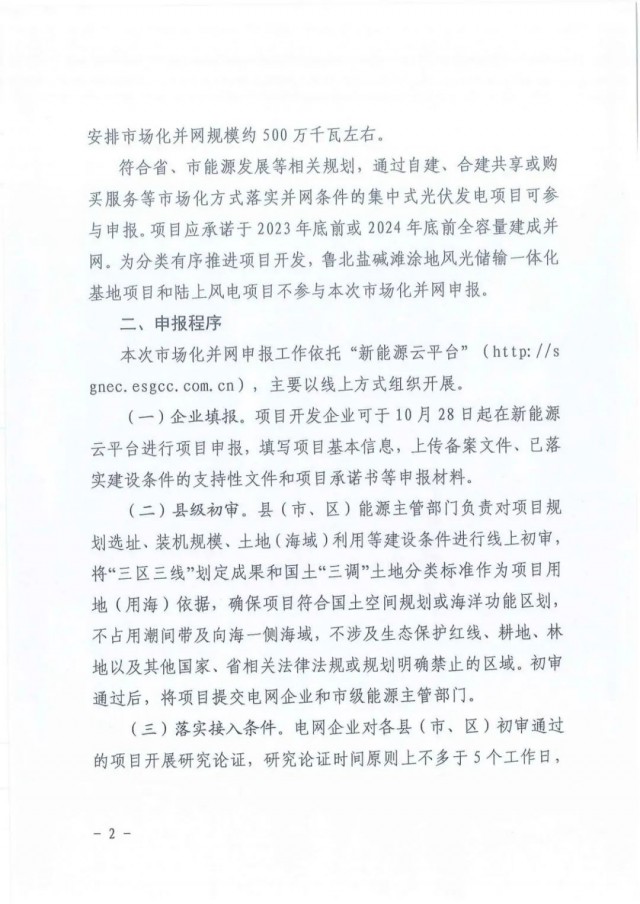 符合省、市能源發(fā)展等相關(guān)規(guī)劃,通過(guò)自建、合建共享或購(gòu)買(mǎi)服務(wù)等市場(chǎng)化方式落實(shí)并網(wǎng)條件的集中式光伏發(fā)電項(xiàng)目可參與申報(bào)。項(xiàng)目應(yīng)承諾于2023年底前或2024年底前全容量建成并網(wǎng)。為分類有序推進(jìn)項(xiàng)目開(kāi)發(fā),魯北鹽堿灘涂地風(fēng)光儲(chǔ)輸一體化基地項(xiàng)目和陸上風(fēng)電項(xiàng)目不參與本次市場(chǎng)化并網(wǎng)申報(bào)。