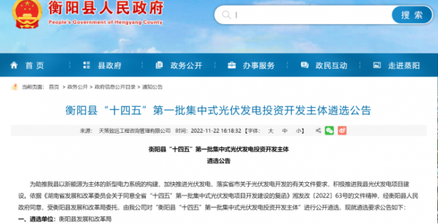 11月22日,湖南省衡陽(yáng)縣“十四五”第一批集中式光伏發(fā)電投資開發(fā)主體遴選公告發(fā)布。