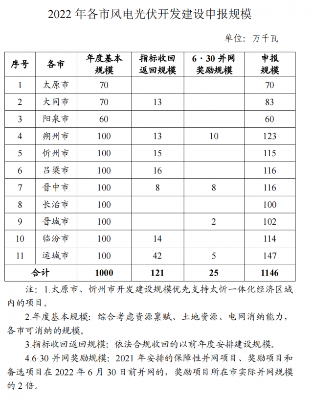 《通知》稱,工作目標為,安排風電、光伏保障性并網(wǎng)年度規(guī)模1000萬千瓦,獎勵規(guī)模146萬千瓦。根據(jù)該通知,2022年呂梁市年度風、光規(guī)模共計116萬千瓦。
