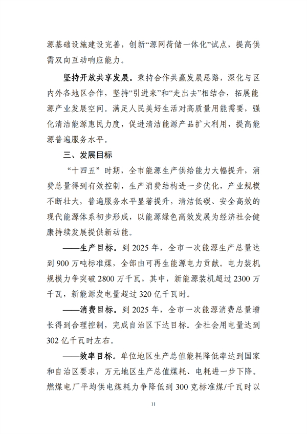 生產(chǎn)目標(biāo):到2025年,全市一次能源生產(chǎn)總量達到900萬噸標(biāo)準煤,全部由可再生能源電力貢獻。電力裝機規(guī)模力爭突破2800萬千瓦,其中,新能源裝機超過2300萬千瓦,新能源發(fā)電量超過320億千瓦時。