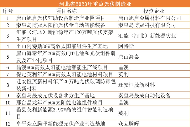 1月18日,河北省發(fā)改委發(fā)布了2023年省級重點建設(shè)項目名單,項目共計507項,總投資1.32萬億元,年度預計投資2600.1億元。其中涉及光伏項目為22項,10個為光伏電站項目,12個為光伏制造業(yè)。