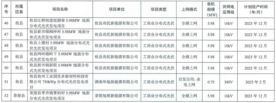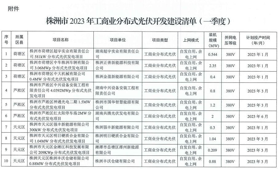 根據(jù)清單,株洲市2023年工商業(yè)分布式光伏項目共計52個,規(guī)模合計153.341MW,計劃投產(chǎn)時間均在2023年內(nèi)。