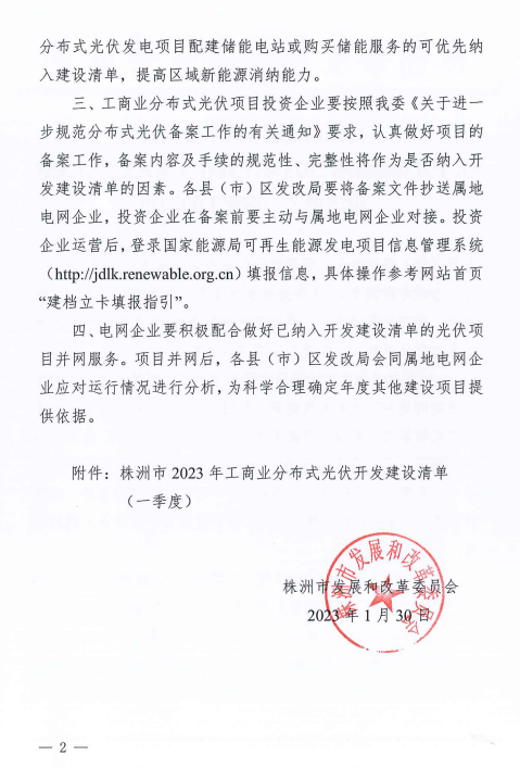 1月31日,湖南省株洲市發(fā)展和改革委員會發(fā)布了株洲市2023年工商業(yè)分布式光伏開發(fā)建設(shè)清單(一季度)的通知。通知指出,各縣(市)區(qū)要加強項目指導(dǎo)、監(jiān)督和管理,確保項目按時建成并網(wǎng)。對于逾期6個月仍未并網(wǎng)的項目,將調(diào)出建設(shè)清單。