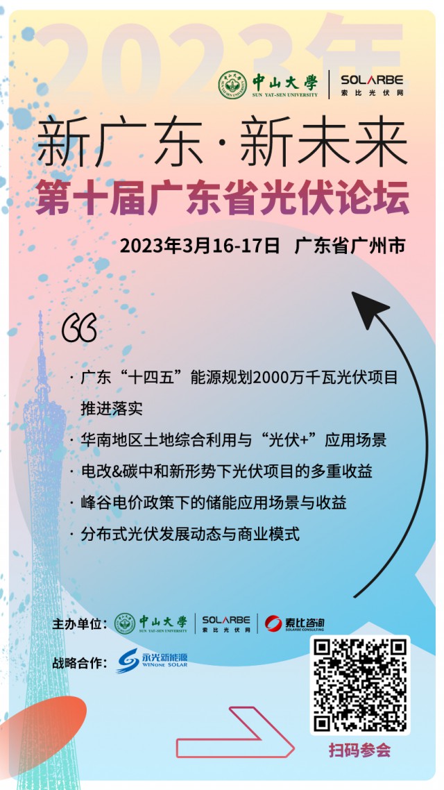 新廣東 新未來!第十屆廣東省光伏論壇 3月16-17日 聚首廣州,為時代籌謀!分布式光伏重心南遷之際與各位同仁一起搶占先機、贏得主動!趕緊點擊了解詳情報名吧!