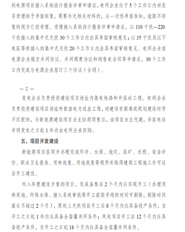 列入年度建設(shè)方案的項目,完成備案后2個月內(nèi)應(yīng)實現(xiàn)開工(辦理用林用地、環(huán)保水保、接入系統(tǒng)審批等開工前期手續(xù)的時間可剔除,剔除時間最長不超過2個月),原則上光伏項目開工后8個月內(nèi)應(yīng)具備投產(chǎn)條件,自開工之日起1年內(nèi)應(yīng)具備全容量并網(wǎng)條件;風(fēng)電項目開工后12個月內(nèi)應(yīng)具備投產(chǎn)條件,自開工之日起18個月內(nèi)應(yīng)具備全容量并網(wǎng)條件。