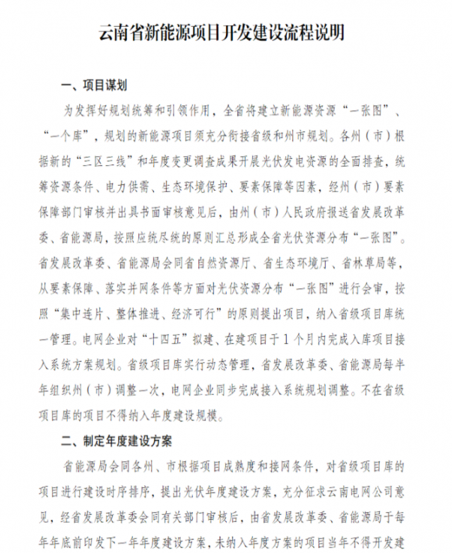 根據(jù)文件,年度方案的制定由省能源局會同各州、市根據(jù)項目成熟度和接網(wǎng)條件,對省級項目庫的項目進行建設(shè)時序排序。年度建設(shè)方案印發(fā)后 2個月內(nèi),州(市)人民政府結(jié)合自身資源稟賦、招商引資需要,組織編制開發(fā)方案(包含組織形式、企業(yè)基本條件和優(yōu)選評審參數(shù)等),堅決防止挑肥揀瘦、小而散、遍地開花式開發(fā)。
