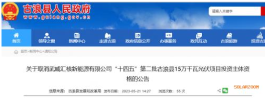 5日21日,甘肅省古浪縣發(fā)展和改革局發(fā)布《關(guān)于取消武威匯核新能源有限公司“十四五”第二批古浪縣15萬千瓦光伏項目投資主體資格的公告》,宣布取消中核匯能甘肅新能源有限公司古浪縣15萬千瓦光伏項目投資主體資格。