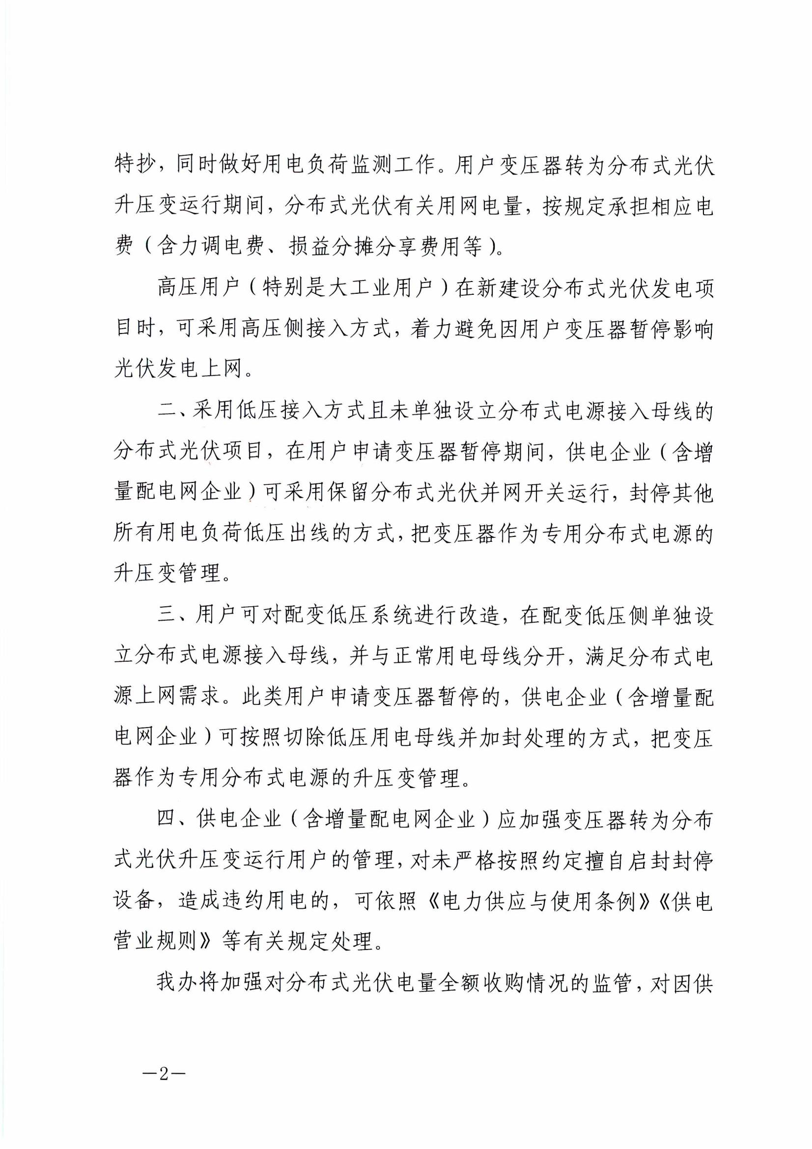 二、采用低壓接入方式且未單獨設(shè)立分布式電源接入母線的分布式光伏項目,在用戶申請變壓器暫停期間,供電企業(yè)(含增量配電網(wǎng)企業(yè))可采用保留分布式光伏并網(wǎng)開關(guān)運行,封停其他所有用電負荷低壓出線的方式,把變壓器作為專用分布式電源的升壓變管理。