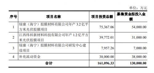 項目的實施主體為綠康(海寧)膠膜材料有限公司,實施地點為浙江省海寧市黃灣鎮(zhèn)海市路35號。項目總投資為75,367.06萬元,擬使用募集資金投入54,000.00萬元。本項目建設(shè)期為12個月,項目建設(shè)完成后將新增16,000萬平方米POE光伏膠膜、12,000萬平方米EVA光伏膠膜和4,000萬平方米EPE光伏膠膜產(chǎn)能,有助于公司進(jìn)一步提高光伏膠膜的生產(chǎn)能力和市場占有率,加快業(yè)務(wù)轉(zhuǎn)型步伐,提升公司市場競爭力。