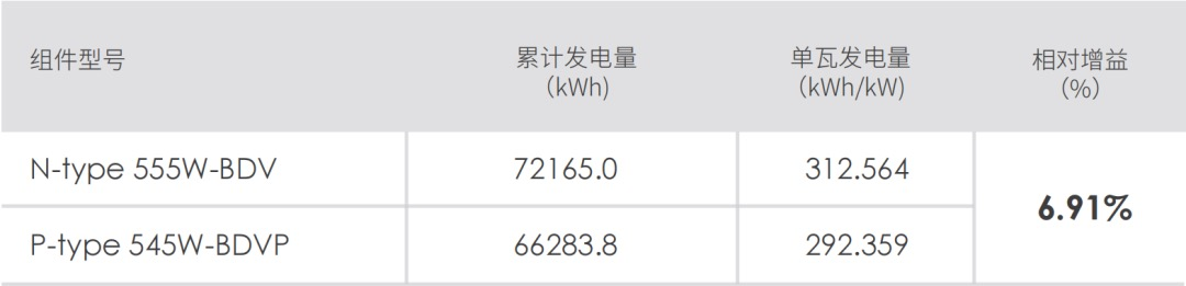 在2023年5月18日-7月19日兩個(gè)月測(cè)試期間,該電站中的N型TOPCon組件有更好的發(fā)電表現(xiàn)。相比于P型PERC組件的單瓦發(fā)電量為292.359kWh/kW,N型組件的單瓦發(fā)電量為312.564kWh/kW,平均增益高達(dá)6.91%。