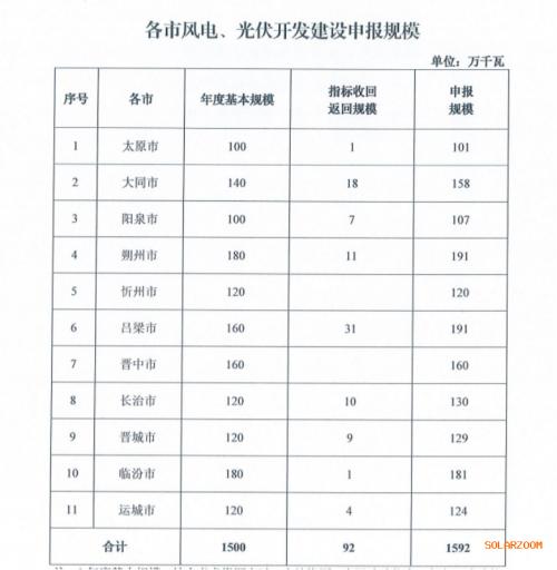 本次優(yōu)選擬擬安排風(fēng)電、光伏保障性并網(wǎng)規(guī)模1500萬千瓦,返回規(guī)模92萬千瓦,合計1592萬千瓦。需要注意的是,晉北采煤沉陷區(qū)6GW新能源基地涉及的6區(qū)縣不再布局省內(nèi)自用保障性并網(wǎng)光伏發(fā)電項目,但其土地資源優(yōu)先保障晉北新能源基地光伏發(fā)電項目。各市擬安排規(guī)模見下: