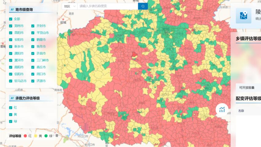 根據全省的分布地圖來看,河南省內大部分區域承載力評估等級為紅色,黃色區域則明顯多于綠色區域。根據平臺提示來看,優先支持在綠色地區開發建設分布式光伏項目,對于黃色區域的項目應開展專項分析后再行開發建設,紅色配變已超過熱穩定極限,無法接入分布式光伏。