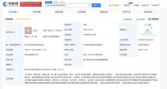 天眼查App顯示,11月20日,黑龍江省新能源集團有限公司成立,法定代表人為劉軼,注冊資本10億人民幣,經(jīng)營范圍含新興能源技術(shù)研發(fā)、風電場相關系統(tǒng)研發(fā)、以自有資金從事投資活動、風力發(fā)電技術(shù)服務、太陽能發(fā)電技術(shù)服務、儲能技術(shù)服務、工程管理服務等。股東信息顯示,該公司由中國一重(601106)、佳電股份(000922)、黑龍江辰能清潔能源有限公司、上海電氣新能源發(fā)展有限公司、北京天潤新能投資有限公司共同持股。