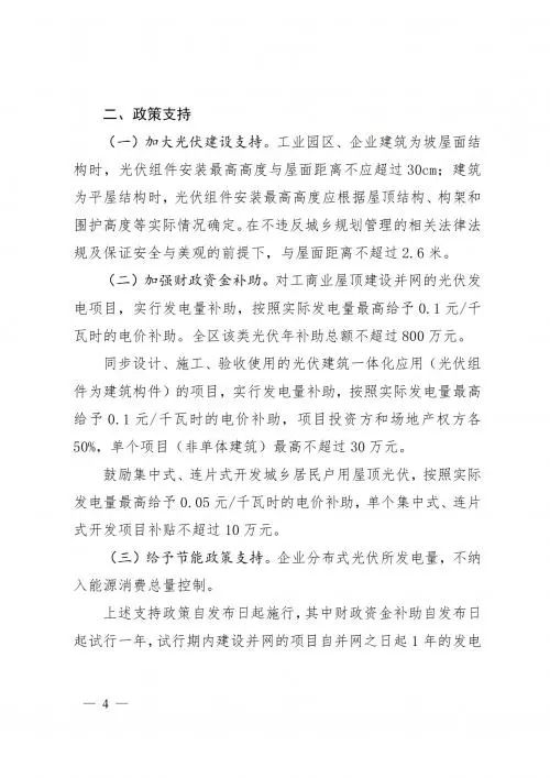 政策方面,文件指出,對(duì)工商業(yè)屋頂建設(shè)并網(wǎng)的光伏發(fā)電項(xiàng)目,實(shí)行發(fā)電量補(bǔ)助,按照實(shí)際發(fā)電量最高給予0.1元/千瓦時(shí)的電價(jià)補(bǔ)助。全區(qū)該類光伏年補(bǔ)助總額不超過(guò)800萬(wàn)元。同步設(shè)計(jì)、施工、驗(yàn)收使用的光伏建筑一體化應(yīng)用(光伏組件為建筑構(gòu)件)的項(xiàng)目,實(shí)行發(fā)電量補(bǔ)助,按照實(shí)際發(fā)電量最高給予0.1元/千瓦時(shí)的電價(jià)補(bǔ)助,項(xiàng)目投資方和場(chǎng)地產(chǎn)權(quán)方各50%,單個(gè)項(xiàng)目(非單體建筑)最高不超過(guò)30萬(wàn)元。鼓勵(lì)集中式、連片式開發(fā)城鄉(xiāng)居民戶用屋頂光伏,按照實(shí)際發(fā)電量最高給予0.05元/千瓦時(shí)的電價(jià)補(bǔ)助,單個(gè)集中式、連片式開發(fā)項(xiàng)目補(bǔ)貼不超過(guò)10萬(wàn)元。