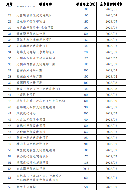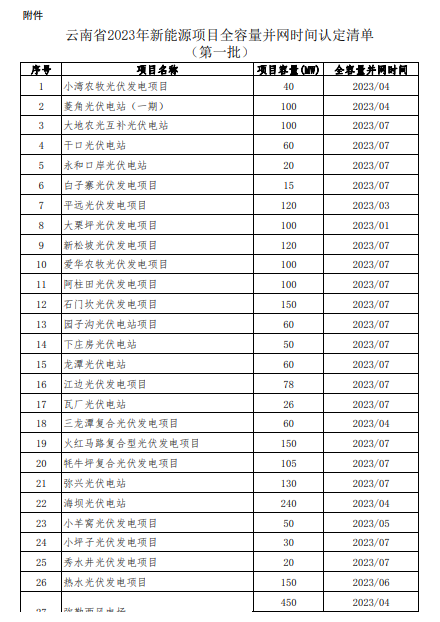 根據(jù)《云南省發(fā)展和改革委員會 云南省能源局關(guān)于云南省光伏發(fā)電上網(wǎng)電價政策有關(guān)事項的通知》(云發(fā)改價格〔2023〕319號)以及《云南省發(fā)展和改革委員會 云南省能源局關(guān)于進(jìn)一步完善風(fēng)電上網(wǎng)電價政策有關(guān)事項的通知》(云發(fā)改價格〔2023〕665號)文件精神,新能源全容量并網(wǎng)時間的認(rèn)定由省能源局會同云南電網(wǎng)公司負(fù)責(zé)。為加強(qiáng)社會監(jiān)督,廣泛征求意見,現(xiàn)將經(jīng)認(rèn)定后的項目清單予以公示,有關(guān)情況如下: