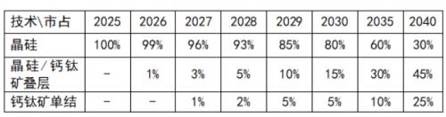但在實(shí)證其戶外壽命之前,不會(huì)有大規(guī)模部署。不過(guò)從晶硅光伏自身的發(fā)展史也可以知道單結(jié)技術(shù)的應(yīng)用也不會(huì)等到其戶外壽命完全被實(shí)證。如果把BIPV應(yīng)用先算上,單結(jié)技術(shù)或在2027-2028年起被規(guī)模化應(yīng)用。
