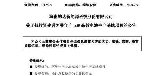 7月25日晚間,鈞達(dá)股份公告稱,公司擬于阿曼蘇丹國(下稱“阿曼”)投資建設(shè)5GW高效電池生產(chǎn)基地,該項(xiàng)目預(yù)計(jì)投資總額2.8億美元,項(xiàng)目建設(shè)周期約9個(gè)月,預(yù)計(jì)2025年建成投產(chǎn)。