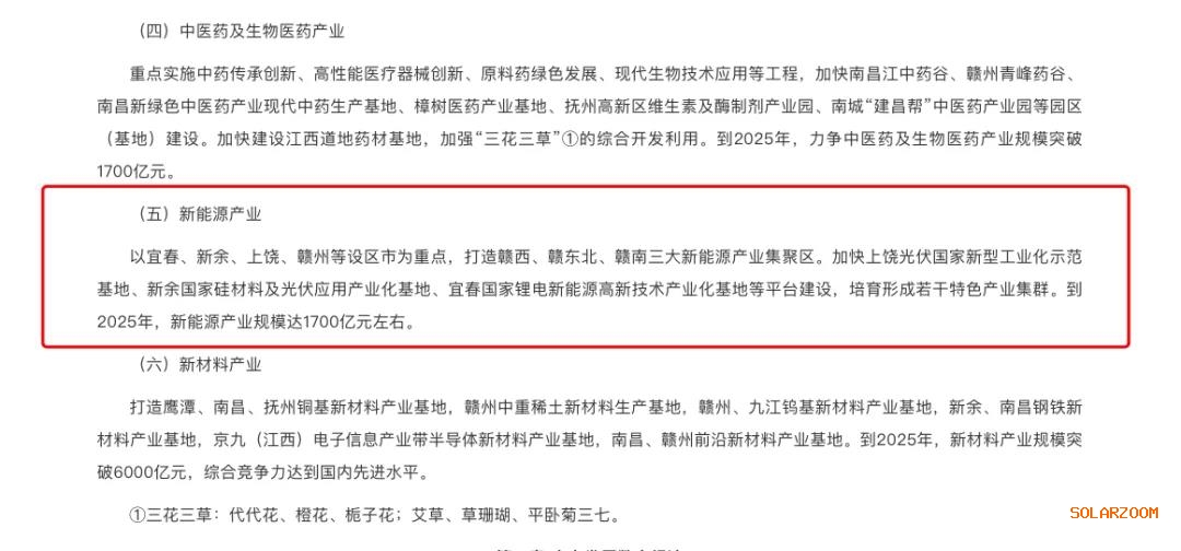 以宜春、新余、上饒、贛州等設區(qū)市為重點,打造贛西、贛東北、贛南三大新能源產(chǎn)業(yè)集聚區(qū)。加快上饒光伏國家新型工業(yè)化示范基地、新余國家硅材料及光伏應用產(chǎn)業(yè)化基地、宜春國家鋰電新能源高新技術產(chǎn)業(yè)化基地等平臺建設,培育形成若干特色產(chǎn)業(yè)集群。到2025年,新能源產(chǎn)業(yè)規(guī)模達1700億元左右。