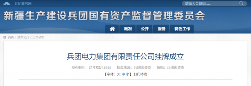 2月26日,從兵團國資委獲悉,新疆生產(chǎn)建設(shè)兵團電力集團有限責(zé)任公司在烏魯木齊舉行揭牌儀式,宣布正式成立。兵團電力集團有限責(zé)任公司是兵團國資國企改革中兵團本級成立的第一個產(chǎn)業(yè)集團公司,企業(yè)注冊資本金5億元,是新疆電力市場的重要主體和能源產(chǎn)業(yè)的新興力量。