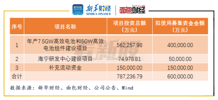 晶科能源此次擬公開發(fā)行不超過26.67億股,發(fā)行股份數(shù)量不超過發(fā)行后總股本的25%,擬募集60億元投向年產(chǎn)7.5GW高效電池和5GW高效電池組件建設(shè)項目(以下簡稱“高效電池及組件項目”)、海寧研發(fā)中心建設(shè)項目以及補(bǔ)充流動資金。其中高效電池及組件項目擬使用募集資金金額為40億元,占此次擬募集資金總額的66.67%,是此次募資的主要投資項目。