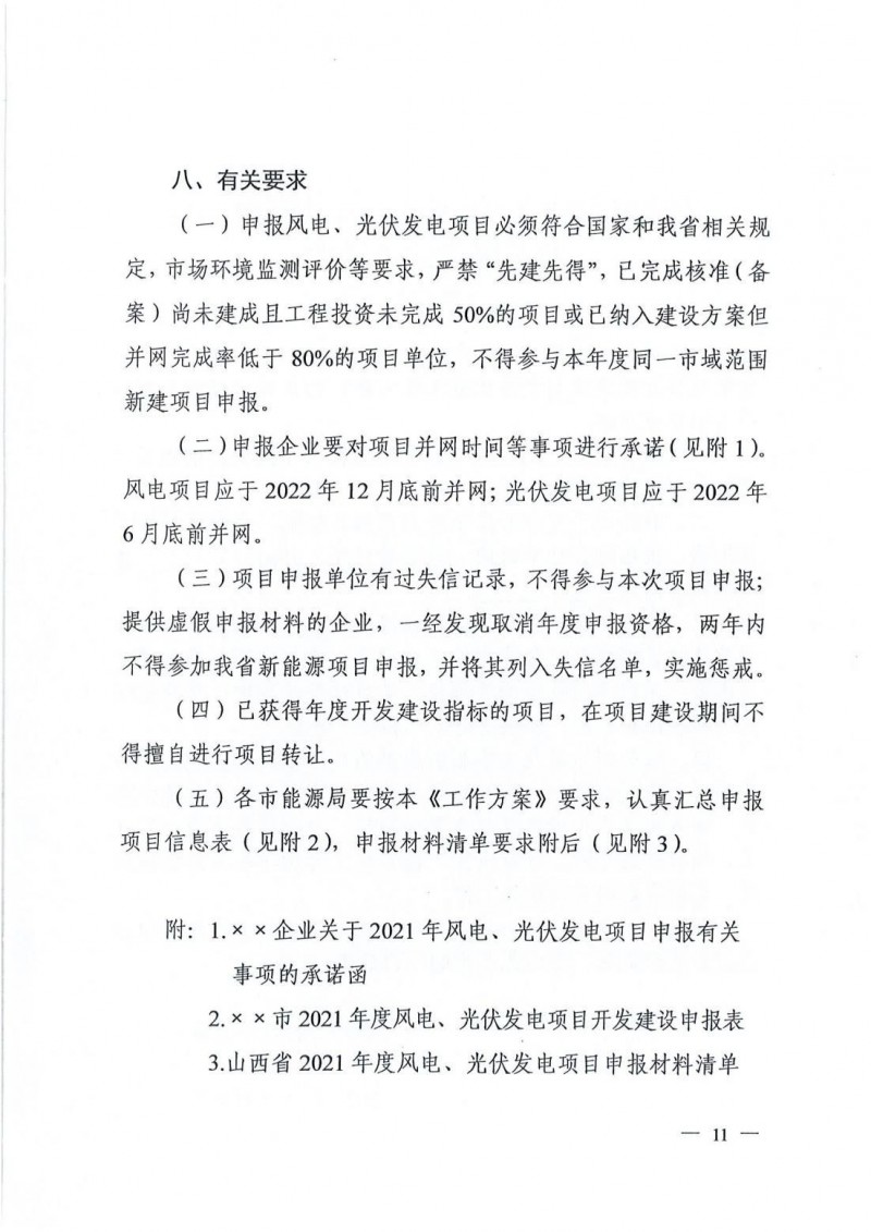 申報(bào)風(fēng)電項(xiàng)目應(yīng)于2022年12月底前并網(wǎng);光伏發(fā)電項(xiàng)目應(yīng)于2022年6月底前并網(wǎng)。申報(bào)材料于9月10日下午18:00前送至山西省投資咨詢和發(fā)展規(guī)劃院。