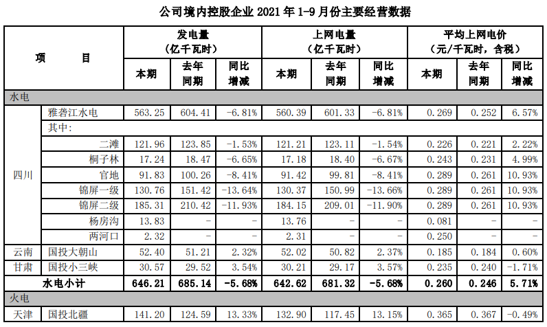 2021年1-9月,公司境內(nèi)控股企業(yè)平均上網(wǎng)電價 0.318元/ 千瓦時,與去年同期相比增加了5.99%。