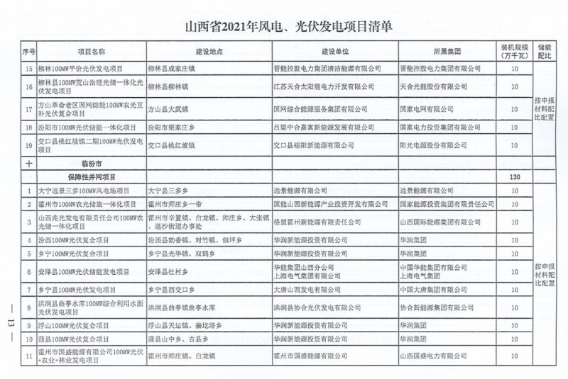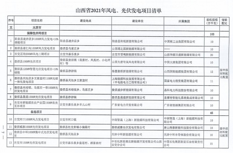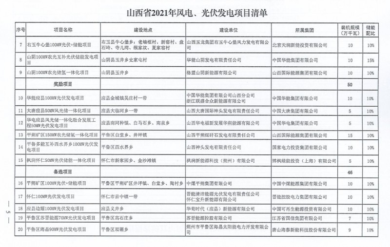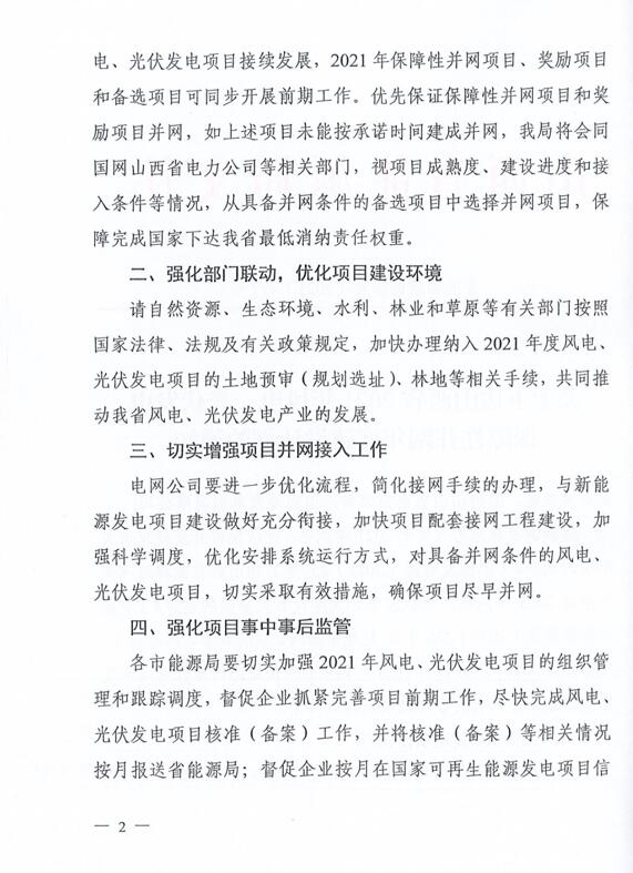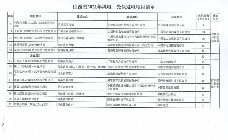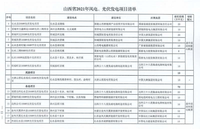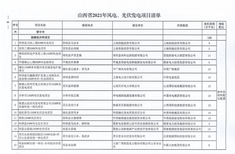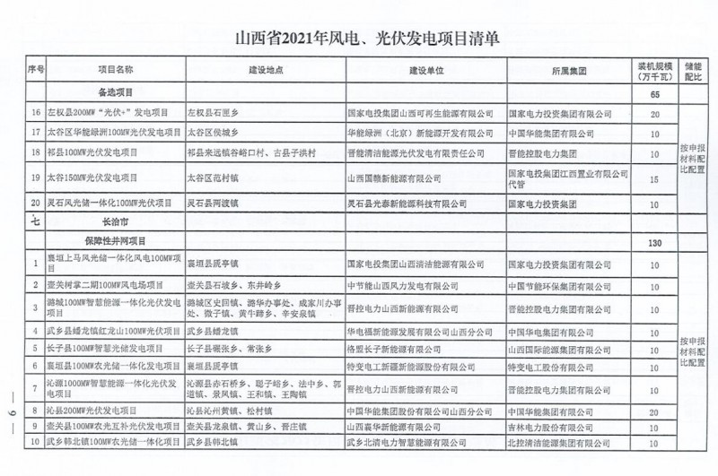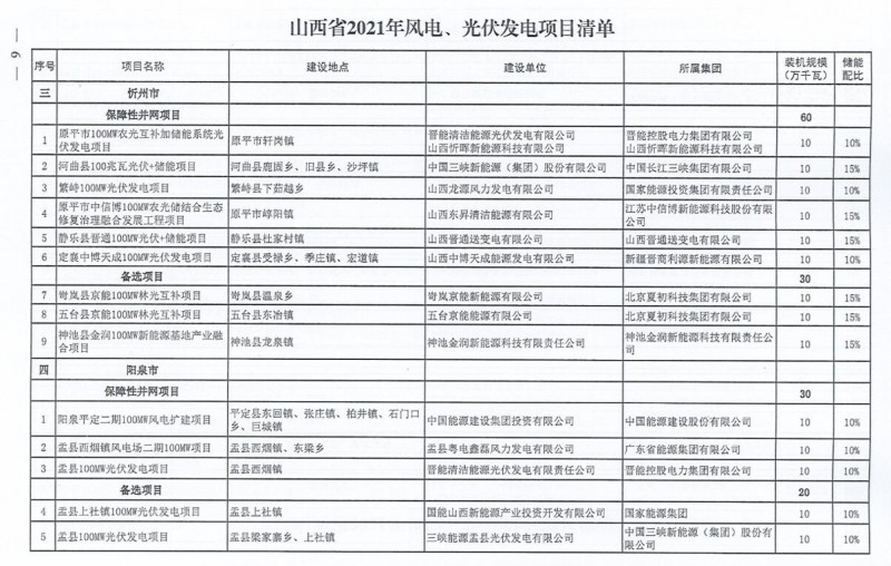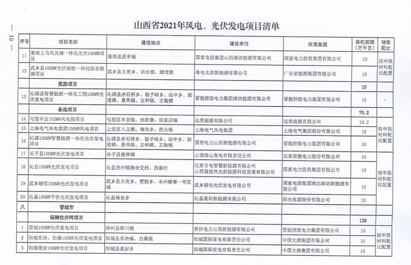 10月22日,山西省能源局下達2021年度風(fēng)電、光伏發(fā)電保障性并網(wǎng)年度建設(shè)計劃。風(fēng)、光合計17.792GW,其中保障性11.2GW+獎勵700MW+備選5.892GW。文件明確保障性規(guī)模與獎勵規(guī)模可同步開展前期工作,優(yōu)先保證保障性并網(wǎng)項目和獎勵項目并網(wǎng),如上述項目未能按承諾時間并網(wǎng),將視項目成熟度、建設(shè)進度和接入條件等,從備選項目中選擇并網(wǎng)項目,保障完成國家下達的最低消納責(zé)任權(quán)重。