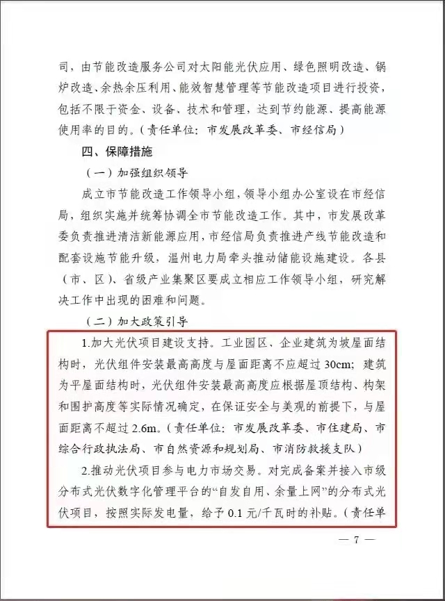 近日浙江溫州市和平湖市相繼公示了分布式補貼標準。10月25日,溫州市人民政府辦公室關于印發(fā)溫州市制造業(yè)千企節(jié)能改造行動方案(2021-2023)的通知。其中要求加大光伏項目建設支持。工業(yè)園區(qū)、企業(yè)建筑為坡屋面結構時,光伏組件安裝最高高度與屋面距離不應超過30cm;建筑為平屋面結構時,光伏組件安裝最高高度應根據(jù)屋頂結構、構架和圍護高度等實際情況確定,在保證安全與美觀的前提下,與屋面距離不超過2.6m。