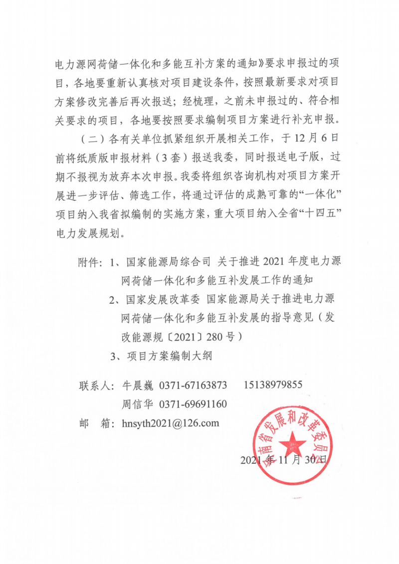 11月30日,河南省發(fā)改委發(fā)布了《關(guān)于補(bǔ)充申報(bào)“十四五”電力源網(wǎng)荷儲(chǔ)一體化和多能互補(bǔ)項(xiàng)目方案》的通知。在今年上半年河南發(fā)改委組織申報(bào)項(xiàng)目的基礎(chǔ)上,再次補(bǔ)充申報(bào)“一體化”項(xiàng)目。