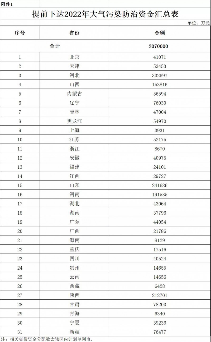 為支持大氣污染防治工作,促進大氣質(zhì)量改善,現(xiàn)下達你省(自治區(qū)、直轄市,以下簡稱省)2022年大氣污染防治資金,用于支持開展減污降碳等方面相關(guān)工作,并就有關(guān)事項通知如下: