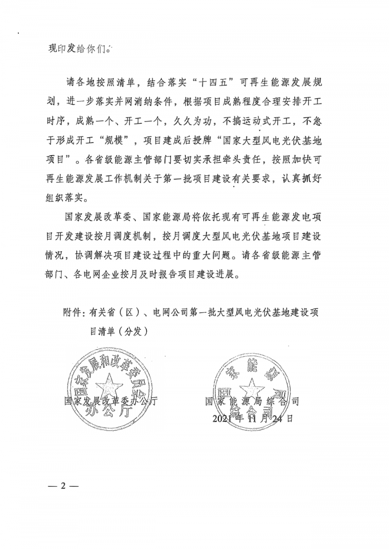 根據(jù)文件,請(qǐng)各地按照清單,結(jié)合落實(shí)“十四五”可再生能源發(fā)展規(guī)劃,進(jìn)一步落實(shí)并網(wǎng)消納條件,根據(jù)項(xiàng)目成熟程度合理安排開(kāi)工時(shí)序,成熟一個(gè)、開(kāi)工一個(gè),久久為功,不搞運(yùn)動(dòng)式開(kāi)工,不急于形成開(kāi)工“規(guī)模”,項(xiàng)目建成后授牌“國(guó)家大型風(fēng)電光伏基地項(xiàng)目”。各省級(jí)能源主管部門要切實(shí)承擔(dān)牽頭責(zé)任,按照加快可再生能源發(fā)展工作機(jī)制關(guān)于第一批項(xiàng)目建設(shè)有關(guān)要求,認(rèn)真抓好組織落實(shí)。