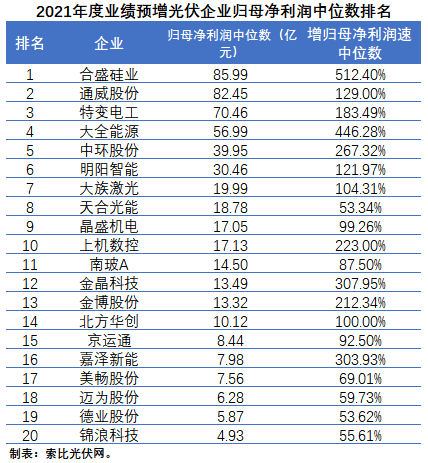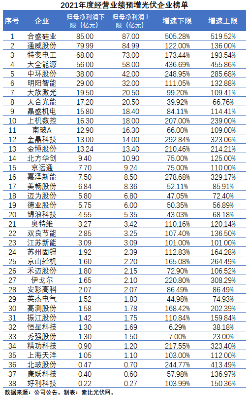 除了這38家企業(yè)以外,其實還有相當多的光伏企業(yè)在2021年經(jīng)營業(yè)績亦呈增長態(tài)勢,只是它們沒有達到業(yè)績預告的披露標準而已。