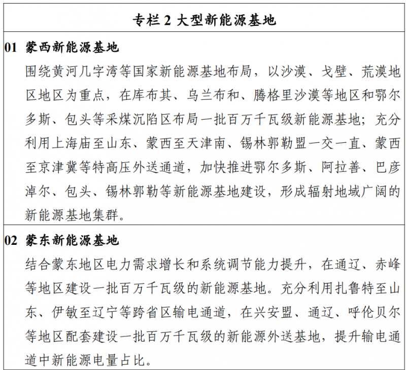 因地制宜推進太陽能熱發(fā)電發(fā)展??偨Y(jié)首批太陽能熱發(fā)電示范項目建設(shè)經(jīng)驗,發(fā)揮太陽能熱發(fā)電儲能調(diào)節(jié)能力和系統(tǒng)支撐能力,因地制宜建設(shè)太陽能熱發(fā)電項目。充分發(fā)揮太陽能熱發(fā)電在電力系統(tǒng)中調(diào)峰、調(diào)頻、儲能等多元功能,統(tǒng) 籌推動太陽能熱發(fā)電與風(fēng)電光伏基地一體化建設(shè)運行,為新能源高比例自用和外送提供支撐,力爭“十四五”期間新增并網(wǎng)太陽能熱發(fā)電項目 50 萬千瓦。加快推進新型儲能技術(shù)規(guī)?;瘧?yīng)用。探索采用自建、合建、租賃和共享等多元化模式,加快推動新型儲能在發(fā)電側(cè)、 電網(wǎng)側(cè)、用戶側(cè)的規(guī)?;瘧?yīng)用,實現(xiàn)新能源與新型儲能的協(xié)同發(fā)展,原則上新建新能源項目要配置 15%(2 小時)以上的儲能設(shè)施。研究出臺存量新能源項目增配儲能的管理辦法,推動已并網(wǎng)的新能源項目增配儲能設(shè)施,提高消納和調(diào)峰能力。在充分發(fā)揮電力外送通道配套火電機組深度調(diào)峰能力的基礎(chǔ)上,合理規(guī)劃建設(shè)送端配套新型儲能設(shè)施,支撐大規(guī)模風(fēng)、光等可再生能源電源接入,提升外送通道可再生能源電量占比。二、充分提升可再生能源就地消納水平加快配套電網(wǎng)建設(shè)。優(yōu)化升級電網(wǎng)主網(wǎng)架,解決電網(wǎng)結(jié)構(gòu)性問題,提升電力互濟能力,提高電網(wǎng)運行效率和安全穩(wěn)定水平。加快推動新能源送出工程建設(shè),滿足新能源大規(guī)模開發(fā)的匯集與送出需求。推動配電網(wǎng)擴容改造和智能化升 級,提升配電網(wǎng)柔性開放接入能力、靈活控制能力和抗擾動能力,增加電網(wǎng)就地就近平衡能力,構(gòu)建適應(yīng)分布式可再生能源并網(wǎng)和多元負荷需要的智能配電網(wǎng)。提升系統(tǒng)調(diào)節(jié)能力。積極推進煤電靈活性改造,推動自備電廠主動參與調(diào)峰,加快建設(shè)天然氣調(diào)峰電站,充分提升系統(tǒng)調(diào)節(jié)能力。優(yōu)化電力調(diào)度運行,合理安排系統(tǒng)開機方式, 動態(tài)調(diào)整各類電源發(fā)電計劃,探索推進多種電源聯(lián)合調(diào)度。創(chuàng)新調(diào)度運行與市場機制,促進可再生能源在省級電網(wǎng)內(nèi)就地消納。三、穩(wěn)步有序推動可再生能源外送消納充分發(fā)揮自治區(qū)可再生能源資源優(yōu)勢和區(qū)位優(yōu)勢,按照提升一批、投產(chǎn)一批、開工一批的發(fā)展思路,努力提高輸電 通道中新能源電量的占比,提高特高壓輸電通道利用率,大力提升可再生能源外送消納能力,有序推動國家級新能源電力供應(yīng)保障基地建設(shè),助力全國碳達峰碳中和。“十四五” 期間,規(guī)劃新增新能源外送基地 2900 萬千瓦,力爭累計投產(chǎn) 3900 萬千瓦。加快推動已批復(fù)新能源外送基地投產(chǎn)運行。加快推動錫林郭勒盟“一交一直”一期、上海廟至山東一期、扎魯特至青州特高壓輸電通道配套新能源基地、烏蘭察布風(fēng)電基地等已批復(fù)新能源基地建設(shè)進度,力爭 2025 年前建成投產(chǎn) 1500 萬千瓦左右。提升既有外送通道中新能源電量占比。提高自治區(qū)可再生能源外送規(guī)模,在蒙西至天津南交流特高壓、上海廟至山 東直流特高壓、錫林郭勒盟交直流特高壓等既有特高壓外送 輸電通道以及傳統(tǒng)火電廠外送專線基礎(chǔ)上,統(tǒng)籌送端周邊地區(qū)資源條件和環(huán)境約束,合理優(yōu)化風(fēng)能、太陽能資源配置方 案,增配布局一批新能源基地,大幅提高存量外送輸電通道中可再生能源占比和通道利用效率,“十四五”期間建成外送新能源 1900 萬千瓦。積極推進新建蒙西外送通道配套新能源基地開工建設(shè)。統(tǒng)籌優(yōu)化蒙西地區(qū)風(fēng)能、太陽能資源和接入條件,在資源稟賦較好、開發(fā)建設(shè)條件優(yōu)越、具備持續(xù)整裝開發(fā)條件的地區(qū), 推進風(fēng)能、太陽能、煤炭等多能互補發(fā)展,有序建設(shè)一批百萬千瓦級新能源基地,實現(xiàn)高比例可再生能源外送,力爭2025 年前推動開工配套新能源基地 1000 萬千瓦。