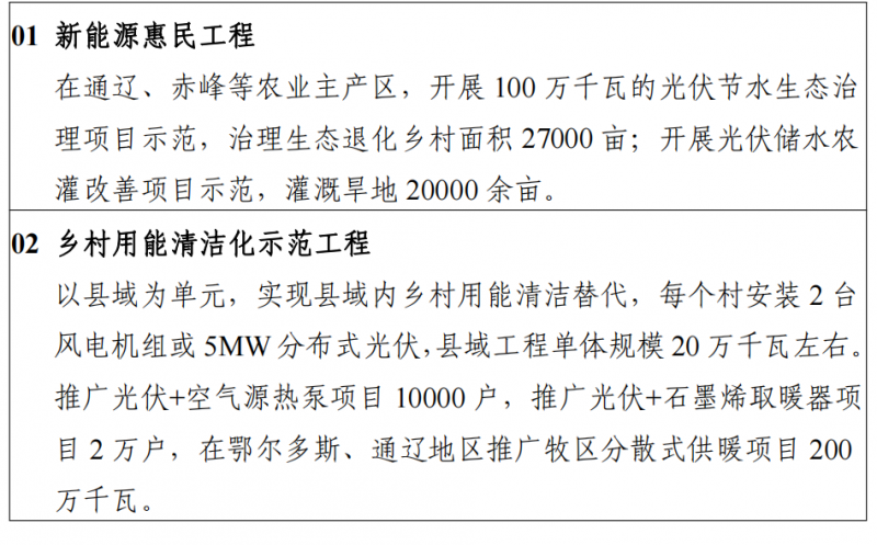 五、加快推動農(nóng)村能源革命助力鄉(xiāng)村振興新能源惠民工程。開展農(nóng)網(wǎng)鞏固提升工程,與提升風(fēng)電、光伏等分布式電能就近接入有機結(jié)合,提升鄉(xiāng)村電氣化水平,提高農(nóng)電服務(wù)水平,推進農(nóng)網(wǎng)智能化。在電網(wǎng)基礎(chǔ)建設(shè)薄弱且用電負荷分散度較高的偏遠末端配電網(wǎng)、農(nóng)區(qū)牧區(qū)等地區(qū),因地制宜推動風(fēng)電、光伏開發(fā)。在通遼、赤峰等盟市, 開展光伏儲水農(nóng)灌改善工程和光伏節(jié)水生態(tài)治理工程示范, 提升電網(wǎng)農(nóng)灌期供電可靠性,構(gòu)建新型節(jié)水灌溉系統(tǒng),有效實現(xiàn)節(jié)水節(jié)能、生態(tài)恢復(fù)治理。自治區(qū)鄉(xiāng)村人口約 960 萬人,開展 100 萬千瓦新能源惠民工程,滿足農(nóng)村牧區(qū)清潔用能需求。鄉(xiāng)村用能清潔化示范工程。推動鄉(xiāng)村產(chǎn)業(yè)、農(nóng)業(yè)生產(chǎn)和農(nóng)村生活用能清潔化,以分布式光伏、分散式風(fēng)電、地?zé)崮芾脼楹诵模_展智慧用能大棚、清潔供暖、綠色出行等智慧用能示范。加快提升呼包鄂周邊、蒙東鄉(xiāng)村可再生能源供暖水平,合理配比分散式風(fēng)電和分布式光伏,利用電熱膜、電鍋爐、空氣源熱泵、石墨烯取暖器等供暖設(shè)施,形成清潔能源支持產(chǎn)業(yè)發(fā)展、產(chǎn)業(yè)發(fā)展助力鄉(xiāng)村振興的農(nóng)村安居環(huán) 境。在通遼、鄂爾多斯等農(nóng)牧區(qū),開展牧區(qū)清潔供暖示范項目,探索離網(wǎng)式新能源供電供熱模式,滿足農(nóng)村牧區(qū)清潔用能需求。在蒙東地區(qū)人口密集的旗縣,充分利用當(dāng)?shù)亟斩捹Y源開展生物質(zhì)發(fā)電供暖示范,實現(xiàn)旗縣區(qū)域生物質(zhì)供暖規(guī)?;娲?,提升可再生能源消費占比,推廣生物質(zhì)碳化與固化及高效低排節(jié)能爐具。
