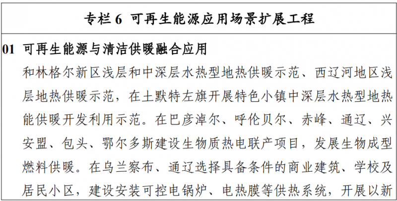 四、廣泛擴展可再生能源應(yīng)用場景實施火電靈活性改造。加快存量煤電改造升級,推廣深度調(diào)峰技術(shù)應(yīng)用,積極推進現(xiàn)役煤電機組實施靈活性改造, 鼓勵新建煤電機組靈活性制造,降低新建煤電機組最小技術(shù)出力水平,提升電力系統(tǒng)整體消納能力,促進新能源大規(guī)模開發(fā)和高效利用,引導(dǎo)煤電由主力電源逐步向“支撐型”、“調(diào) 節(jié)型”電源轉(zhuǎn)變。推進工業(yè)園區(qū)可再生替代。充分挖掘燃煤自備電廠園區(qū)的電源靈活調(diào)節(jié)能力和負荷側(cè)需求響應(yīng)能力,推動園區(qū)自備電廠參與調(diào)峰,改變單一依靠自備火電的傳統(tǒng)供能方式,因地制宜推動風(fēng)電、光伏建設(shè),鼓勵集中式與分布式并舉,在 不占用公共電網(wǎng)的消納空間且保證用能安全的前提下實現(xiàn) 新能源全額自發(fā)自用,逐步實現(xiàn)園區(qū)用能清潔化。開展低碳工業(yè)園區(qū)示范。鼓勵具備新增負荷的園區(qū)開展低碳工業(yè)園示范項目,以近零碳用能為目標(biāo),率先開展全清潔能源供電,提升園區(qū)整體能效。通過自建分布式、新能源專線供電、綠色電力交易、綠證交易等多種方式,實現(xiàn)園區(qū)新增用電需求主要由新能源滿足。同時,鼓勵園區(qū)通過配置儲能等措施,保證與園區(qū)負荷的匹配響應(yīng)和高比例自平衡, 不占用公共電網(wǎng)消納空間。推廣“綠電+綠氫”發(fā)展新模式。鼓勵采用具有適應(yīng)可再生能源出力波動的綠色制氫技術(shù),加快推進風(fēng)光氫儲一體化示范,推廣氫燃料電池汽車在礦山、物流、公交等領(lǐng)域的規(guī)?;瘧?yīng)用,積極探索氫能在冶金、化工、交通等領(lǐng)域的應(yīng)用。開展源網(wǎng)荷儲一體化示范。充分挖掘和釋放生產(chǎn)側(cè)、消費側(cè)調(diào)節(jié)能力,最大化發(fā)揮負荷側(cè)調(diào)節(jié)響應(yīng)能力,就近合理配套新能源,加強源網(wǎng)荷儲多向互動,通過電價優(yōu)勢帶動儲能、大數(shù)據(jù)、新能源、新材料等行業(yè)全產(chǎn)業(yè)鏈發(fā)展。加快烏蘭察布、通遼源網(wǎng)荷儲一體化示范工程建設(shè),提升本地電源支撐,有效緩解供電缺口,推動局部新能源就近消納,不占用公共電網(wǎng)調(diào)峰和消納空間,提升新能源開發(fā)利用水平。持續(xù)推廣可再生能源清潔供暖。發(fā)揮自治區(qū)風(fēng)能、光伏、農(nóng)林、地?zé)豳Y源優(yōu)勢,建立多元化可再生能源清潔供暖體系, 促進環(huán)境質(zhì)量和人民生活條件改善。在呼包鄂城市群積極推動中深層地?zé)崮芤?guī)模化供暖示范,創(chuàng)新城市用能新模式。在蒙東地區(qū)發(fā)展生物質(zhì)熱電聯(lián)產(chǎn)項目,探索以農(nóng)林生物質(zhì)、生物質(zhì)成型燃料等為燃料的生物質(zhì)鍋爐供熱方式,有效保護城鄉(xiāng)環(huán)境。在呼和浩特、包頭、烏蘭察布、通遼等地,開展清潔電供暖示范。大力發(fā)展以新能源為主的綜合能源應(yīng)用。結(jié)合配電網(wǎng)、燃氣網(wǎng)、熱力網(wǎng)等能源網(wǎng)絡(luò),綜合可再生能源、儲能、信息通訊等先進技術(shù),推動分布式可再生能源高效靈活接入與生產(chǎn)消費一體化,建設(shè)冷熱水電氣供應(yīng)的區(qū)域綜合能源系統(tǒng)。