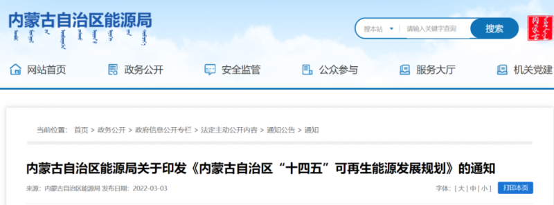 2022年3月2日,內(nèi)蒙古自治區(qū)能源局關(guān)于印發(fā)《內(nèi)蒙古自治區(qū)“十四五”可再生能源發(fā)展規(guī)劃》,提出:"十四五"末,內(nèi)蒙古可再生能源發(fā)電裝機達到 1.35 億千瓦以上,其中風(fēng)電 8900 萬千瓦、光伏發(fā)電 4500 萬千瓦,相當(dāng)于新增風(fēng)電項目5115萬千瓦,光伏項目3262萬千瓦,共8377萬千瓦,包含本地消納和外送兩類。平均利用率保持在 90%以上。同時,將依據(jù)國土空間規(guī)劃,完善可再生能源空間用途管制規(guī)則,保障可再生能源開發(fā)利用合理的用地空間需求。落實草原林地征占用分區(qū)管控政策,保障可再生能源項目使用草原林地需求。規(guī)范土地性質(zhì)認定,明確林草等不同地類的用地標(biāo)準(zhǔn)。