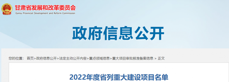 2022年甘肅省省列重大建設(shè)項目投資計劃已經(jīng)省政府審定,并以甘政辦發(fā)〔2022〕11號文件印發(fā)實施。共234個項目,其中計劃新開工項目80個,續(xù)建項目138個,預(yù)備項目16個。具體名單如下: