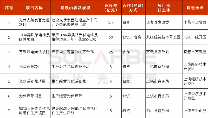 其中7個光伏項目入冊,分別是:南昌市進賢縣光伏支架表面處理項目、九江市經(jīng)開區(qū)年產(chǎn)10GW異質(zhì)結(jié)光伏電池及組件項目、宜春市萬載縣風(fēng)電光伏項目(光伏項目容量為80萬千瓦)、上饒經(jīng)濟技術(shù)開發(fā)區(qū)光伏背板項目、光伏逆變器項目、光伏焊帶項目以及上饒市鉛山縣50GW太陽能光伏電池組件生產(chǎn)等7個項目。